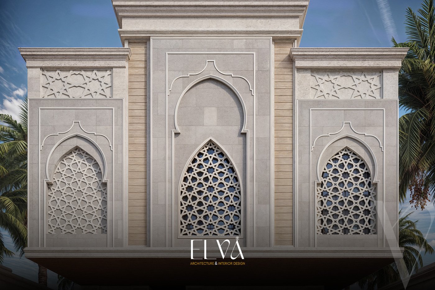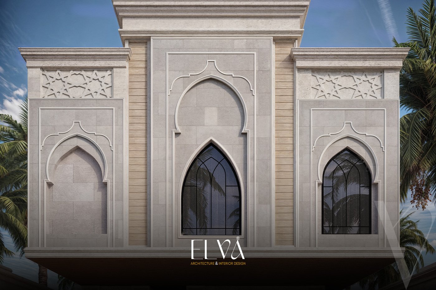 A façade that fuses authenticity and luxury, inspired by traditional Islamic architecture with a modern twist. Arabic motifs are reflected in the arches and windows, adding a refined decorative touch that enhances cultural identity. Natural stone in soft tones evokes a sense of serenity and grandeur, complemented by vertical lines for visual balance. Wooden textures blend harmoniously with stone elements, adding warmth and elegance. The pointed arches create a rhythmic visual flow, giving the façade a timeless and distinguished presence.